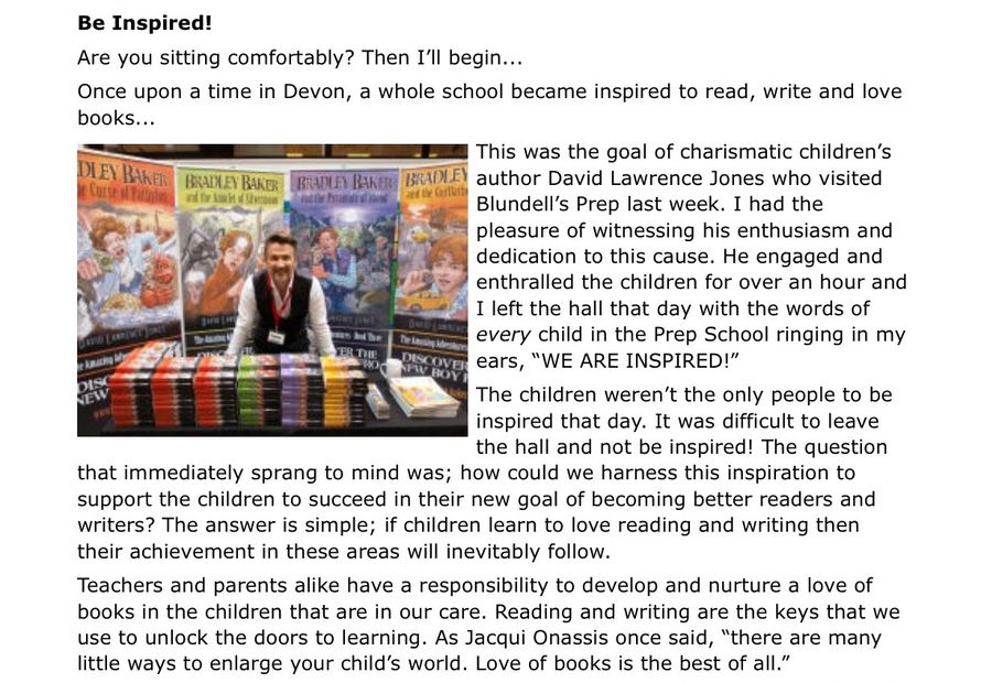 Hi David, you visited my son’s school last week. He absolutely loved that you came in, he’s 10 and in year 5. He’s not had a great start to year 5 and we’ve been struggling getting him to school and enjoying it again, he is a big reader and the day you came in was the first time he came out of school this term with a smile on his face, he was absolutely overjoyed to have actually seen an author!! And now he has a book signed by yourself-Bradley Baker and the curse of Pathylon, thank you so, so much for making him smile about school again, he’s enjoying reading your book tonight and I’ll be purchasing the rest of the series. I’ve said to the school what a fabulous idea this was and hope to see it happen again. Thank you again and hope you have a successful year.